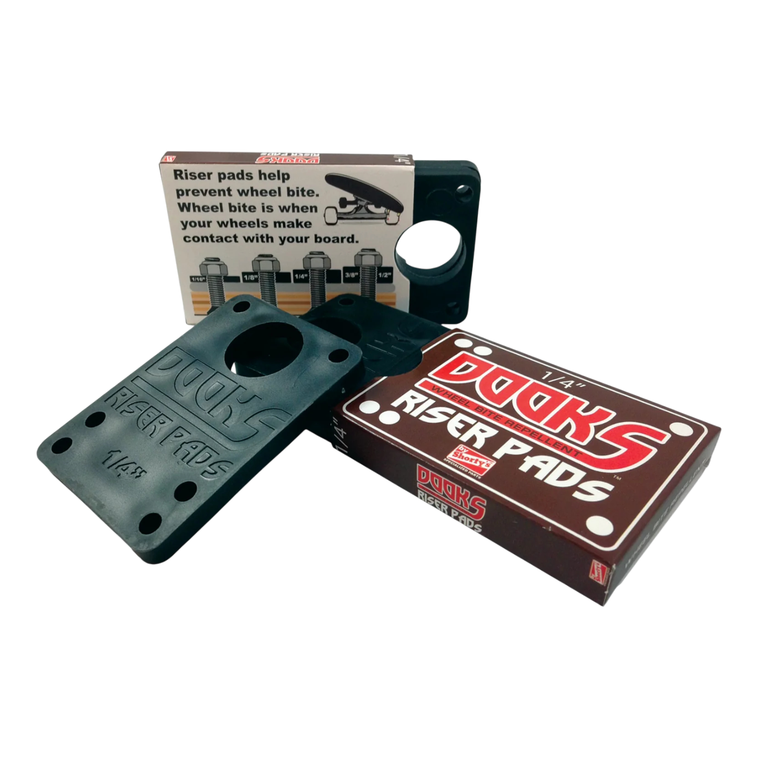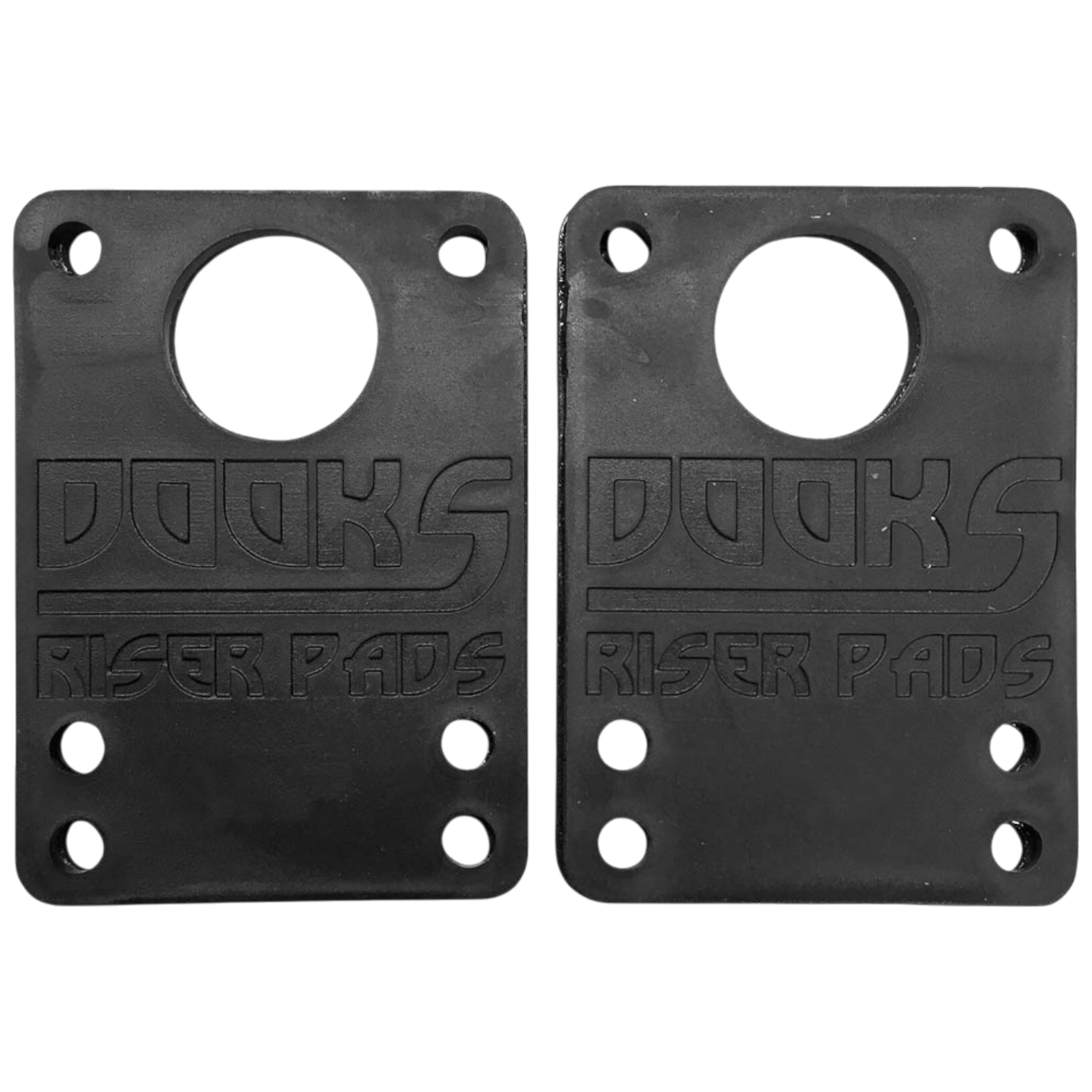 Dooks risers have a few key features; Double hole pattern for old and new school boards and trucks. Kingpin hole for stubborn kingpins that won't go back in flush. The logo and riser size is molded into the top and side for life. Available in 1/8", 1/4" and 1/2".