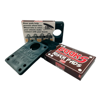 Dooks risers have a few key features; Double hole pattern for old and new school boards and trucks. Kingpin hole for stubborn kingpins that won't go back in flush. The logo and riser size is molded into the top and side for life. Available in 1/8", 1/4" and 1/2".
