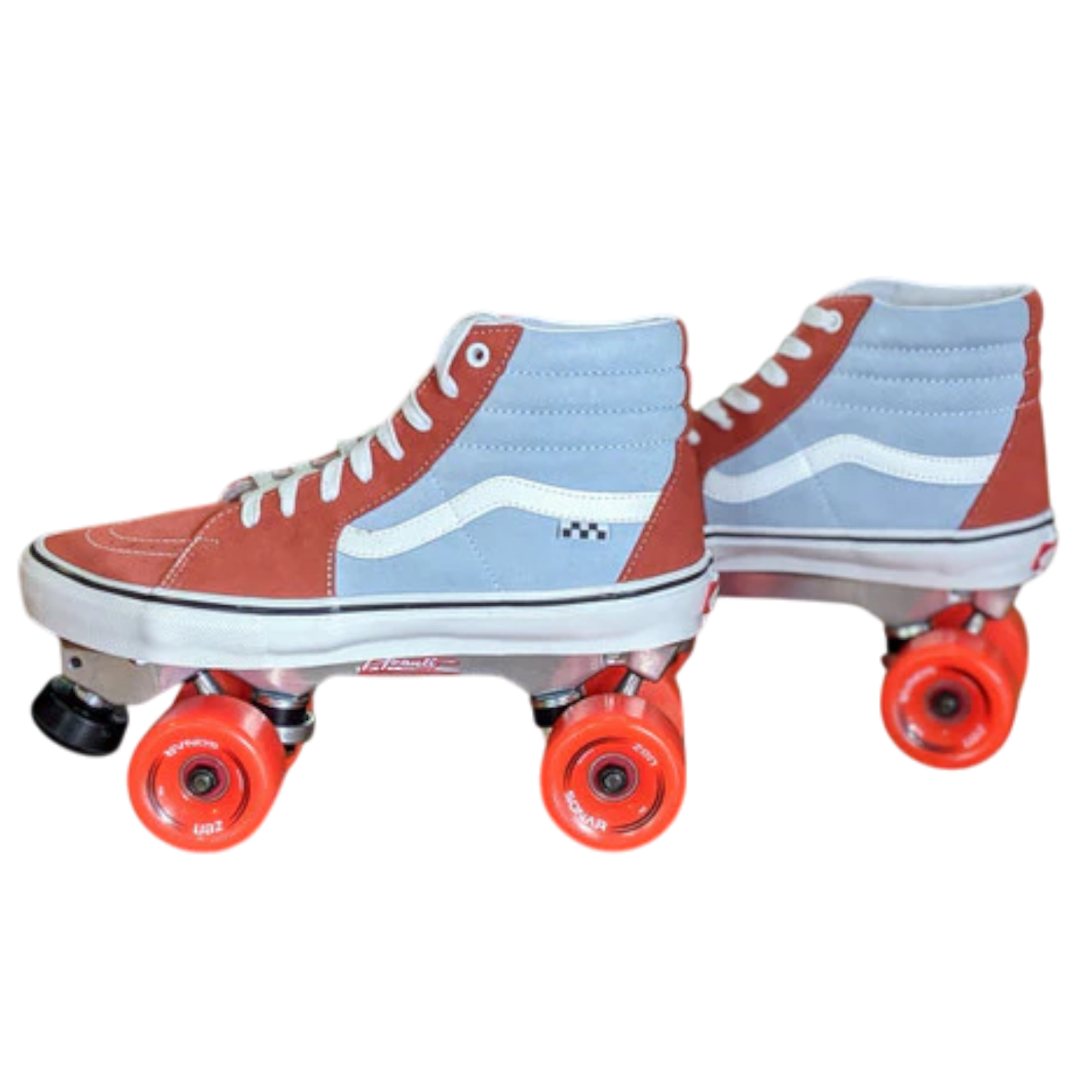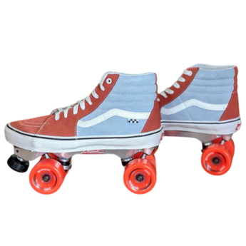 For these rad custom skates we repurpose new Vans Sk8 Hi Skate Shoes by mounting them with an aluminum strengthening insole ( inside the shoe to strengthen the shoe to allow for mounting), aluminum or magnesium roller skate plates, and indoor or outdoor wheels.