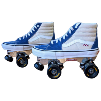 For these rad custom skates we repurpose new Vans Sk8 Hi Skate Shoes by mounting them with an aluminum strengthening insole ( inside the shoe to strengthen the shoe to allow for mounting), aluminum or magnesium roller skate plates, and indoor or outdoor wheels.