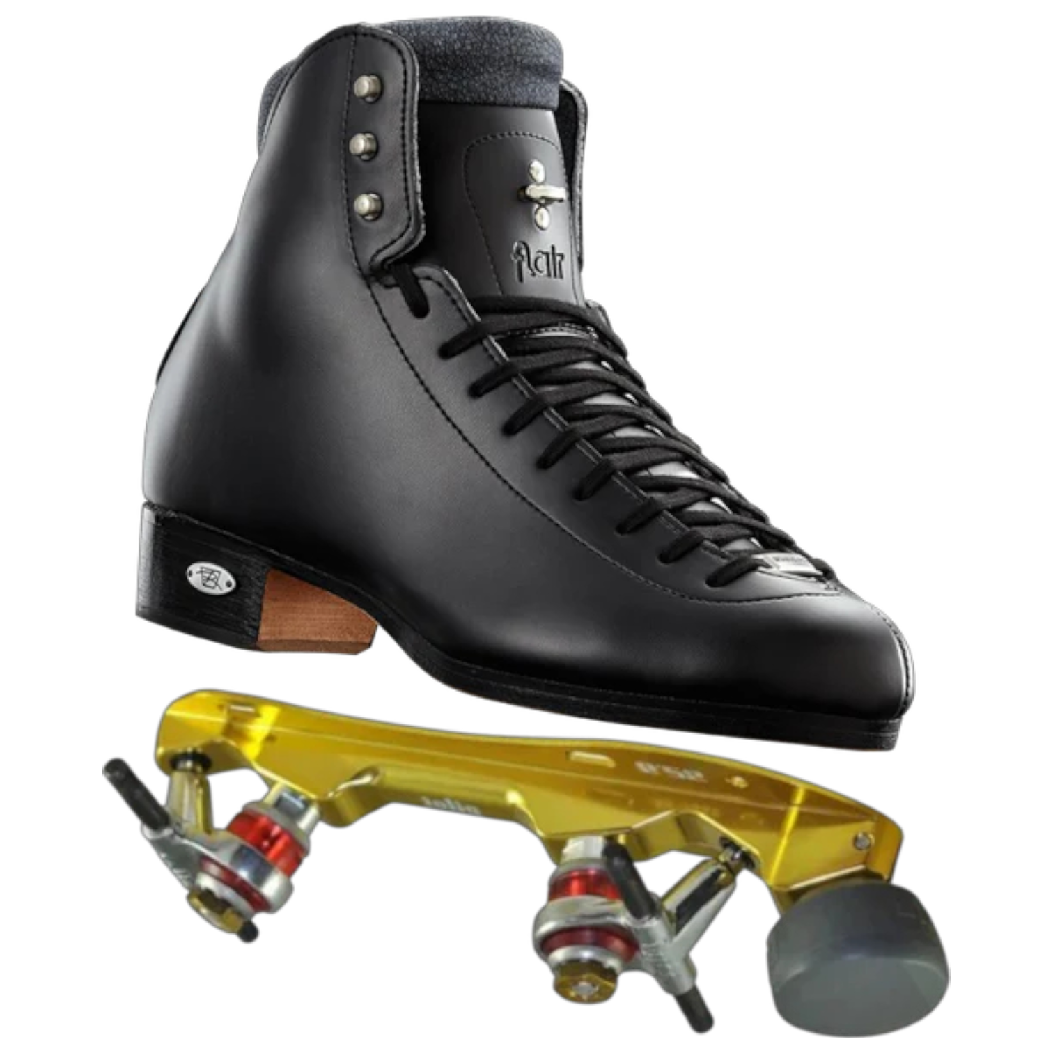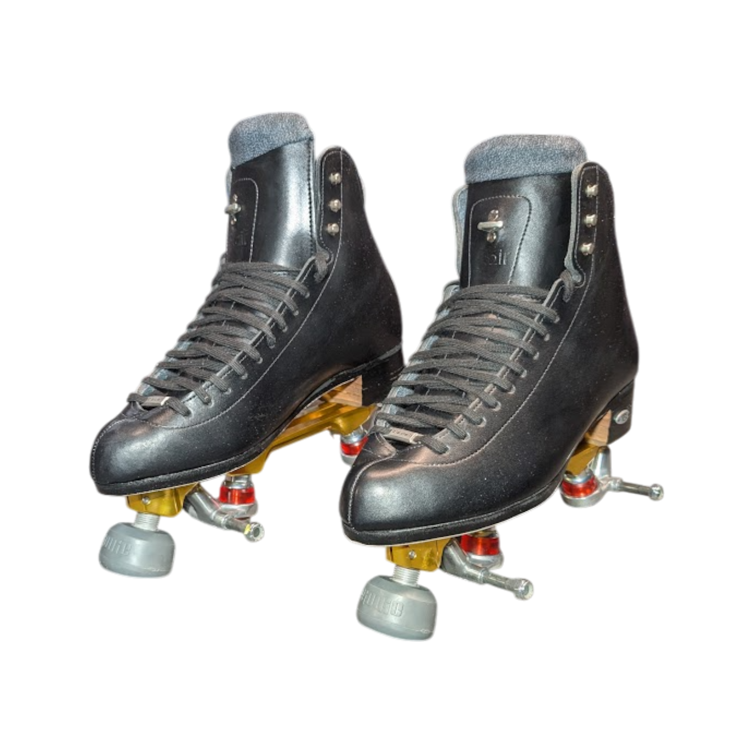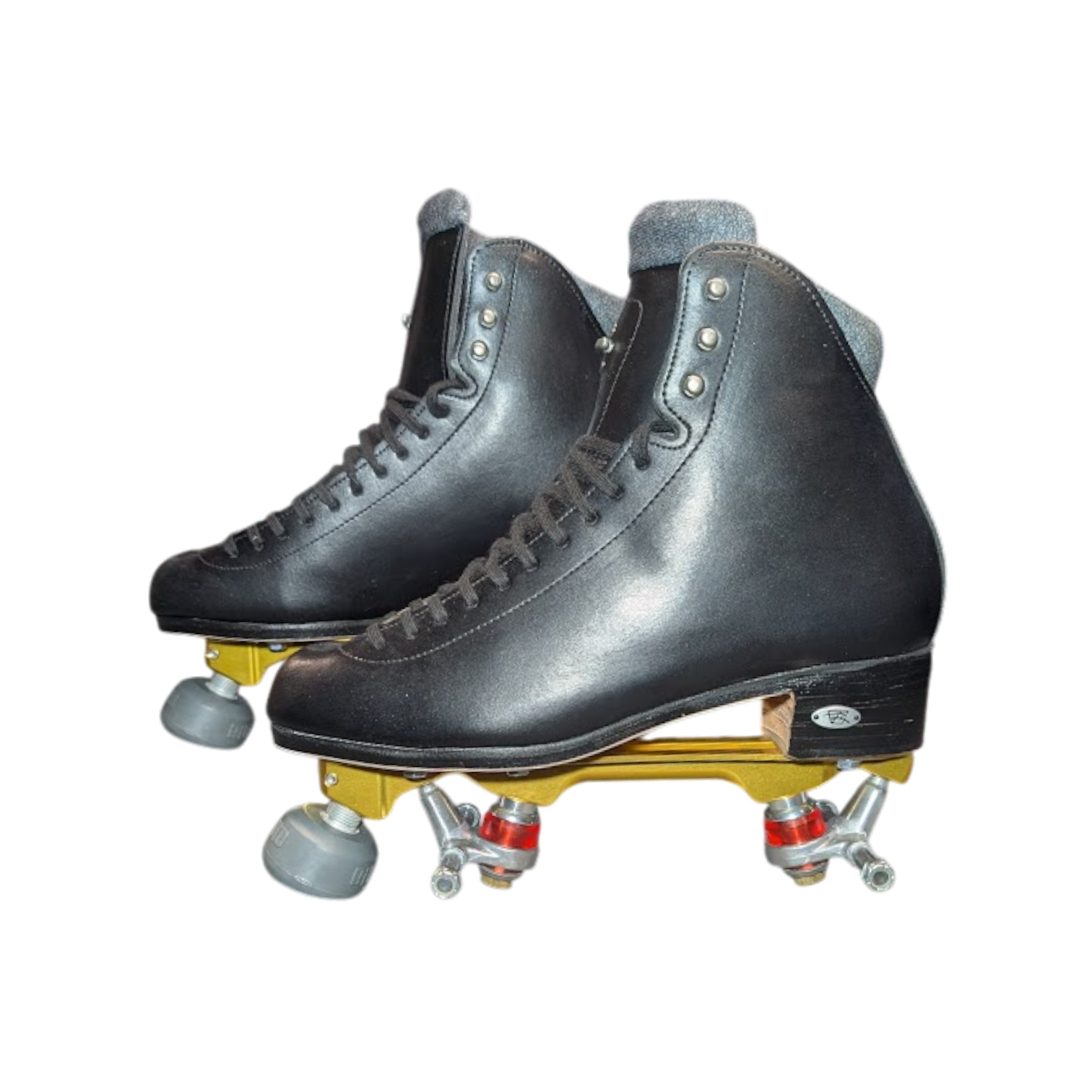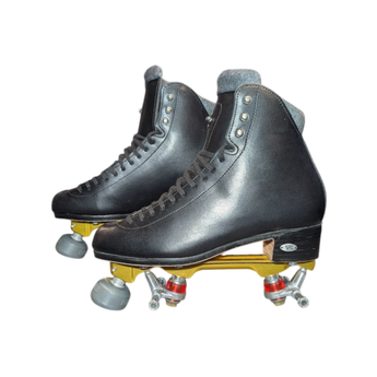 In Stock Riedell/Atom Skates - Black 910 with Gold Pilot Falcon Plates Combo Mens 9.5 - Roller Skate Set
