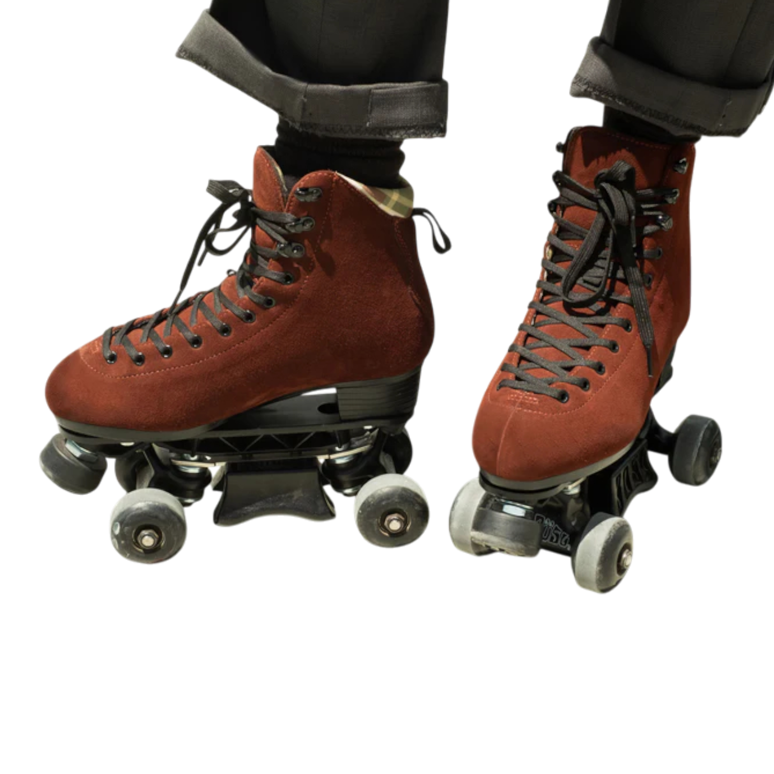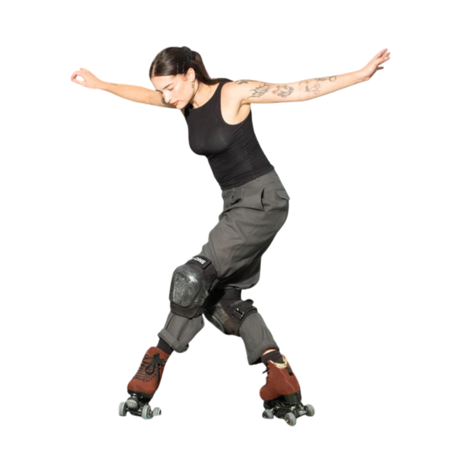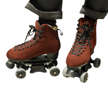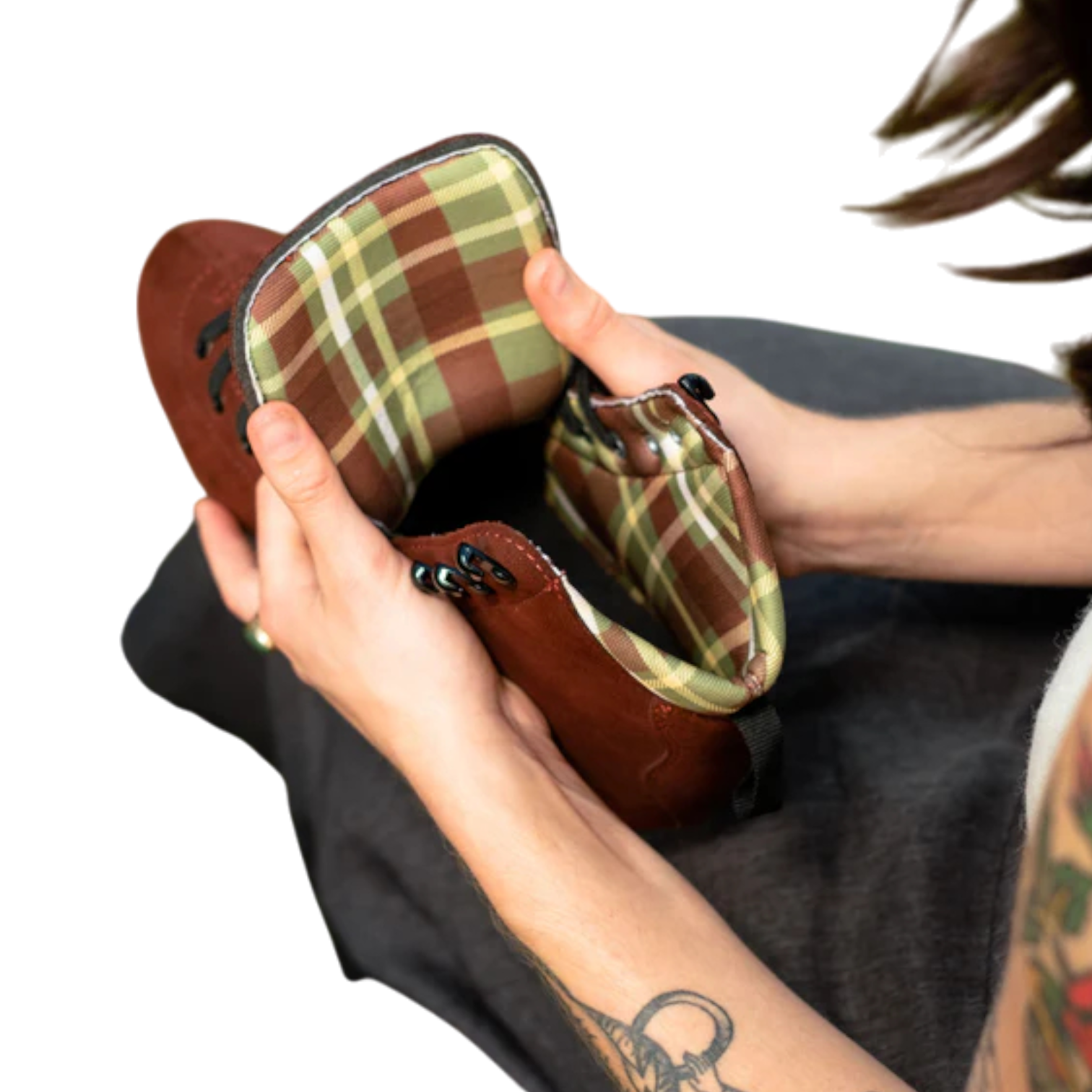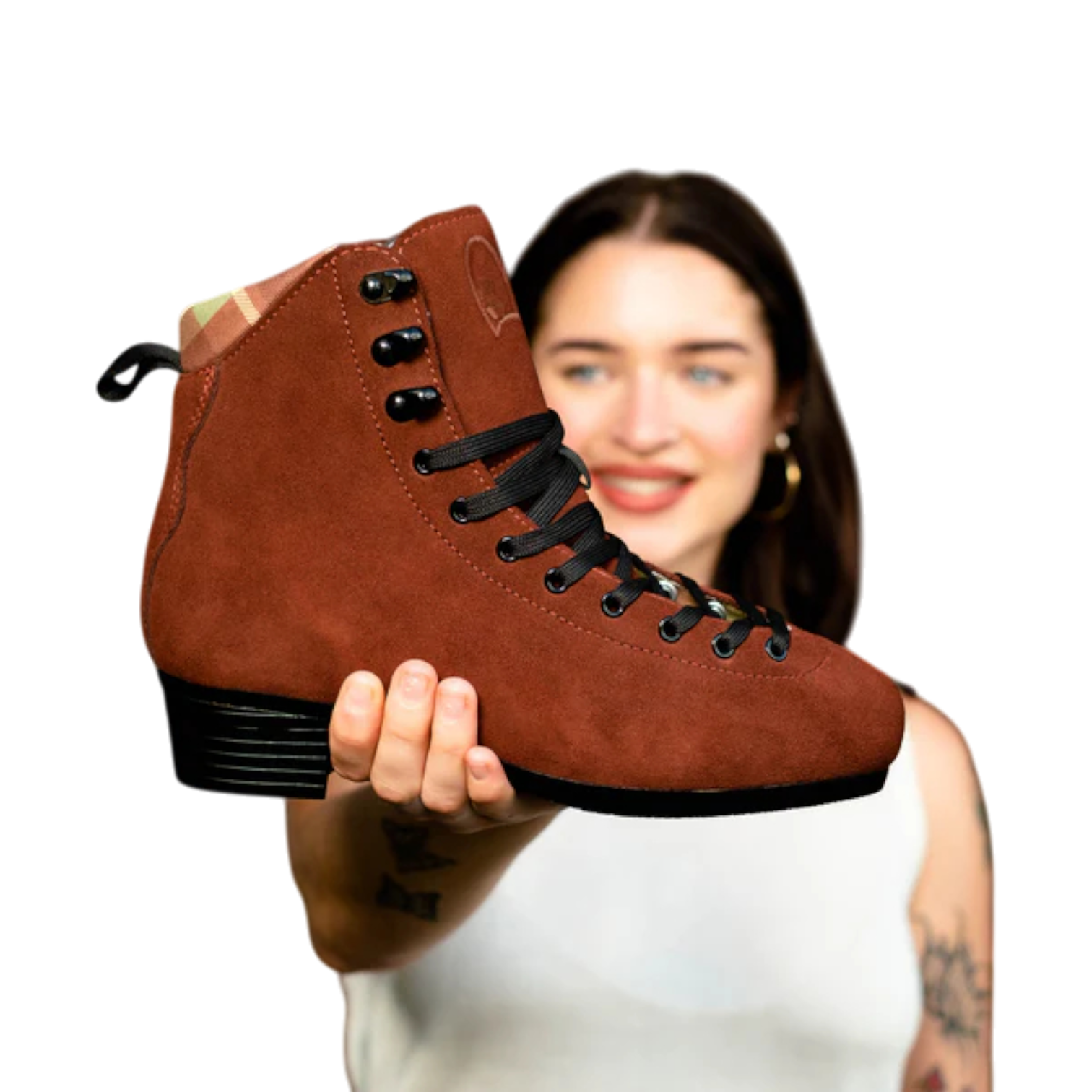 These skates are designed to bear high impact, and provide the support needed for advanced maneuvers and tricks. They are suitable for both park and dance skating. Green plaid lining designed by Zoe Wilson, a dear friend of Jade, matching the beautiful chocolate brown suede.