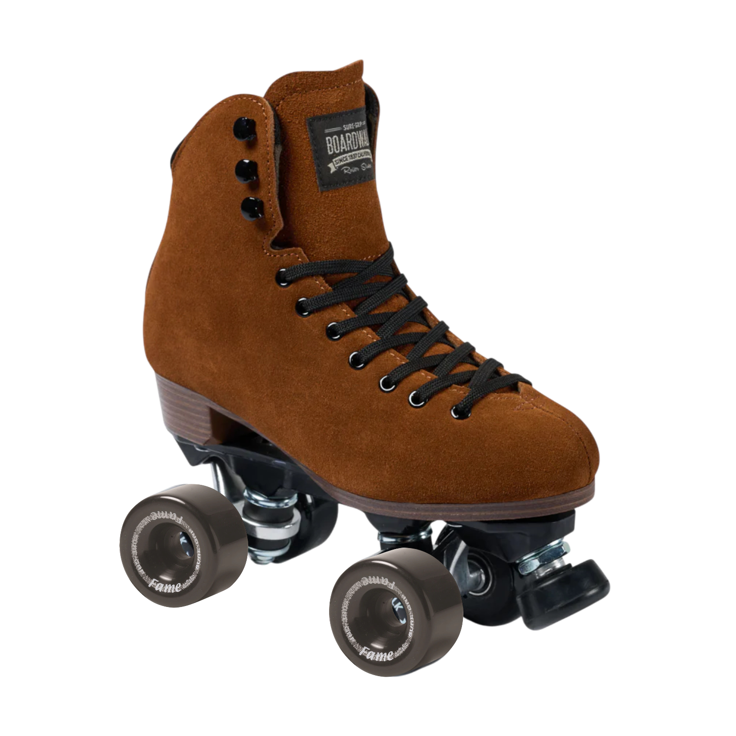 The Boardwalk Plus Fame roller skate for women or men is available in 3 colors, Black, Blueberry, and Cinnamon. The package includes an all-suede boot for added comfort with a stitched sole for extra durability. Plus model includes a padded liner and roller collar. Fame Artistic wheels allow for a smoother roll indoors.