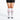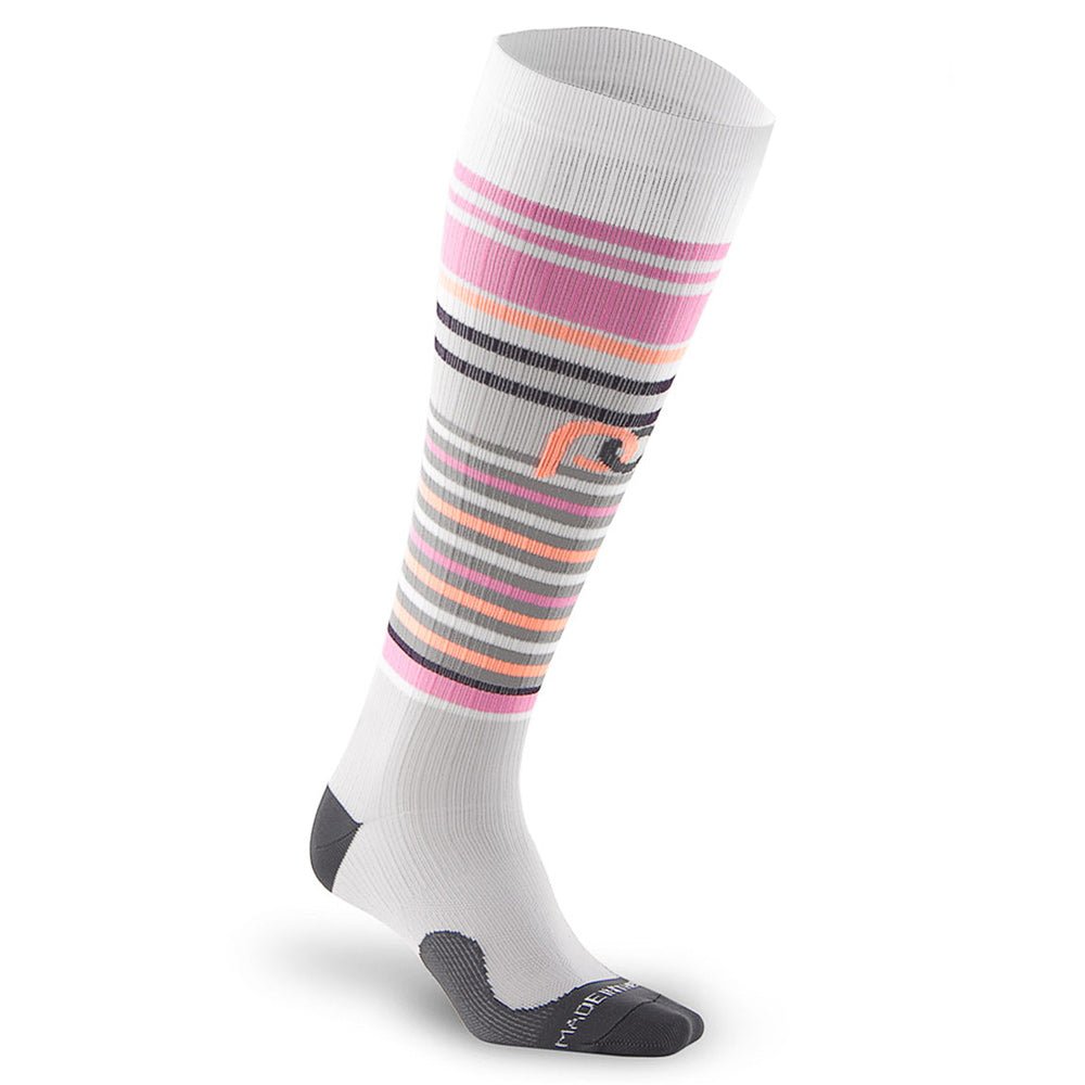 These white compression knee-high socks are accented with white, pink, black, and grey calf stripes along with black toe and heel boxes.