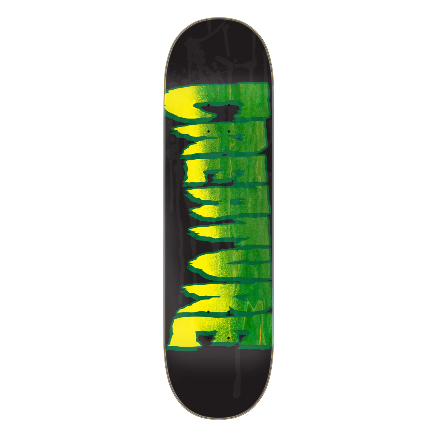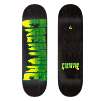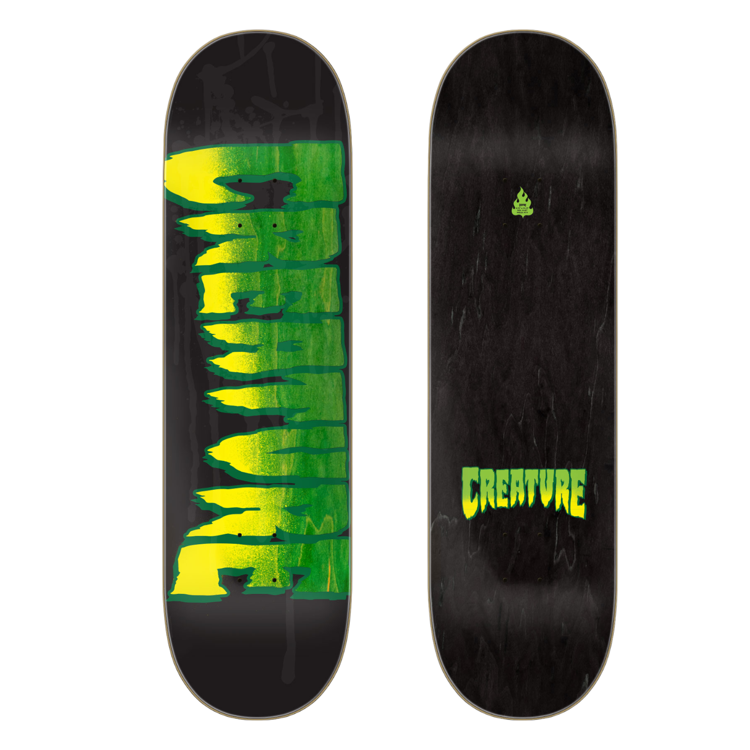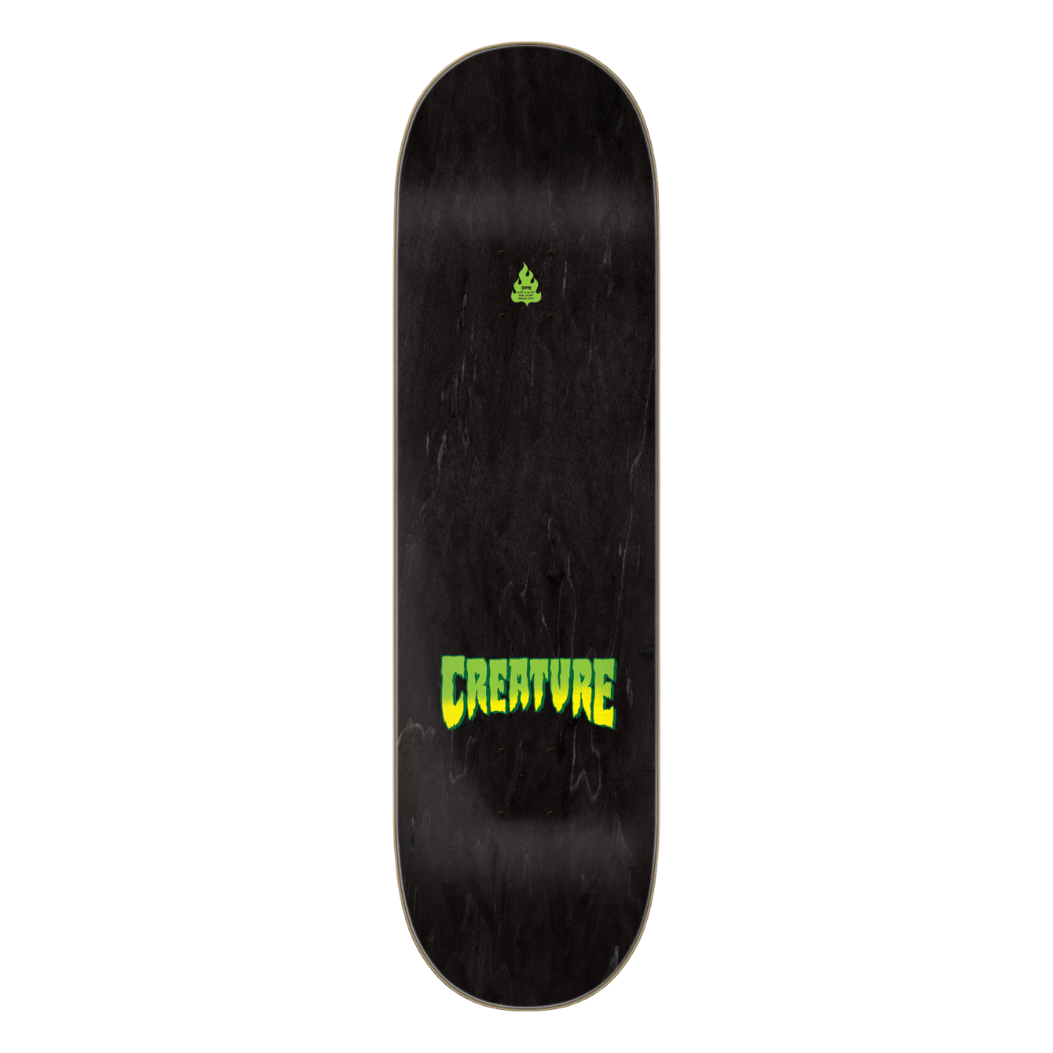 The Creature Logo Spray deck is 8.75in x 32.15in and features 7 ply 100% North American maple, ATV concave and a 14.49in wheelbase.