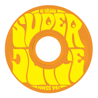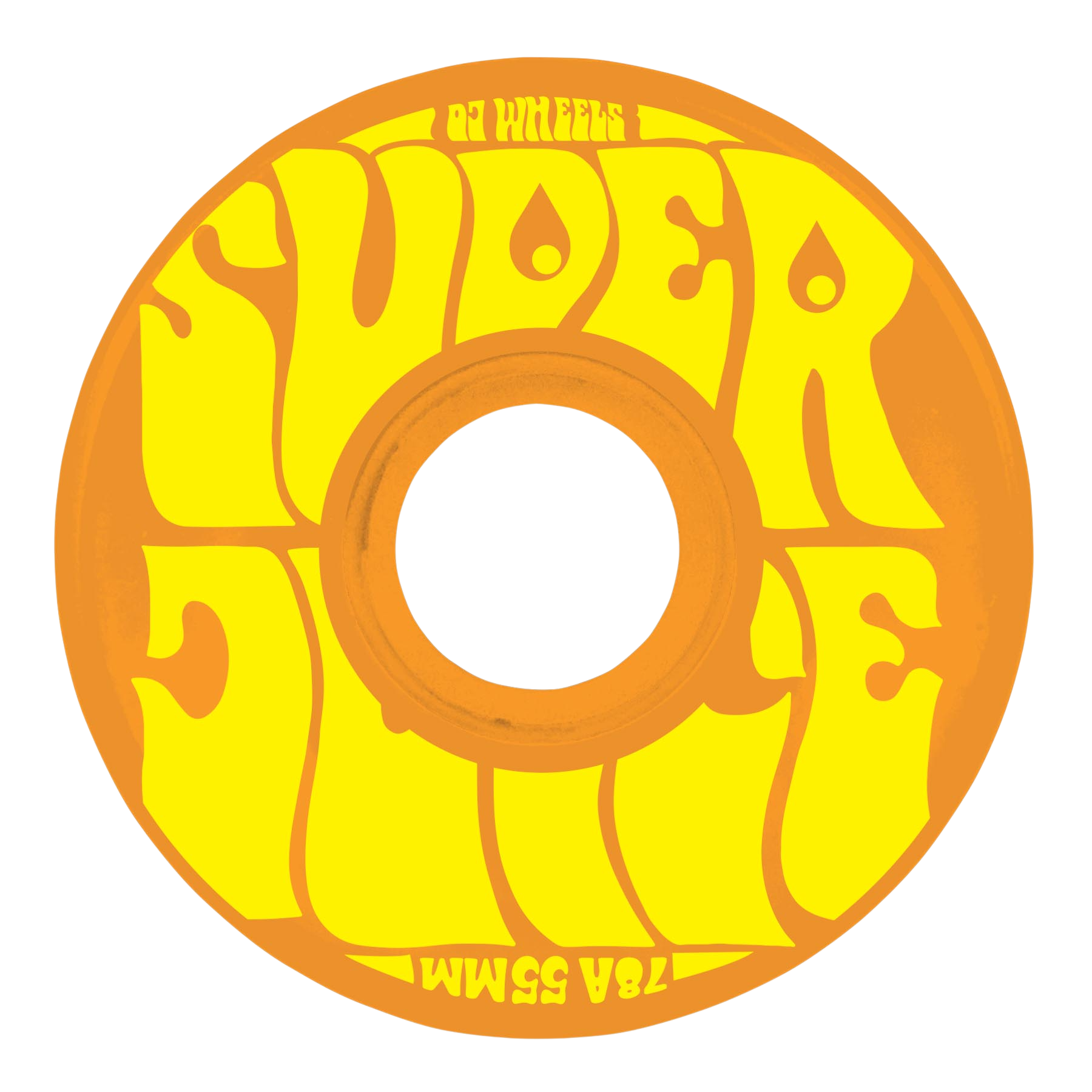 OJ Wheels 55mm, 78a Mini Super Juice orange w/ refreshed yellow graphics.