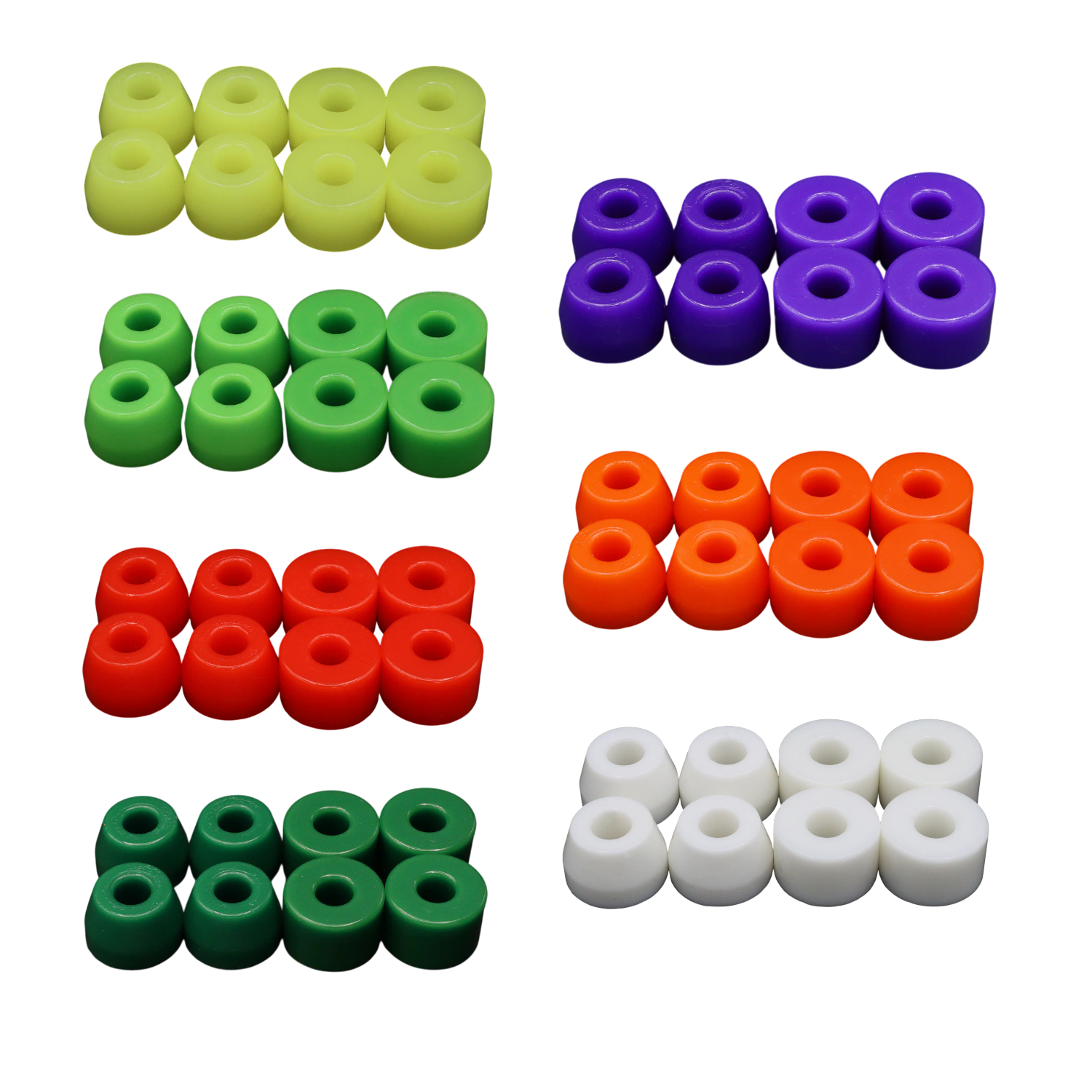 Along that line, lighter riders typically want softer (lower durometer) bushings because they take less weight to turn, and heavier riders typically want harder (higher durometer) bushings. We recommend you look at our weight charts to give you an idea of what each durometer will feel like depending on your weight, especially when combined with different shape combos.