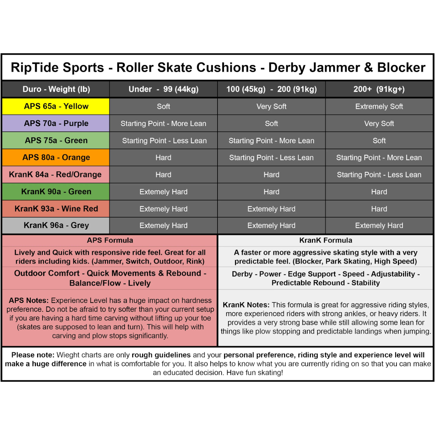 Roller Skate now has specific weight charts since most riders need softer durometers since their weight is divided across two feet, and Roller Skate hangers are smaller. Smaller hangers provide the rider with less leverage to turn, and softer bushings can make up for that. The reverse also applies, where larger hangers like in Electric Skateboards usually need higher duros, which is why we almost exclusively recommend KranK for E-SKate.