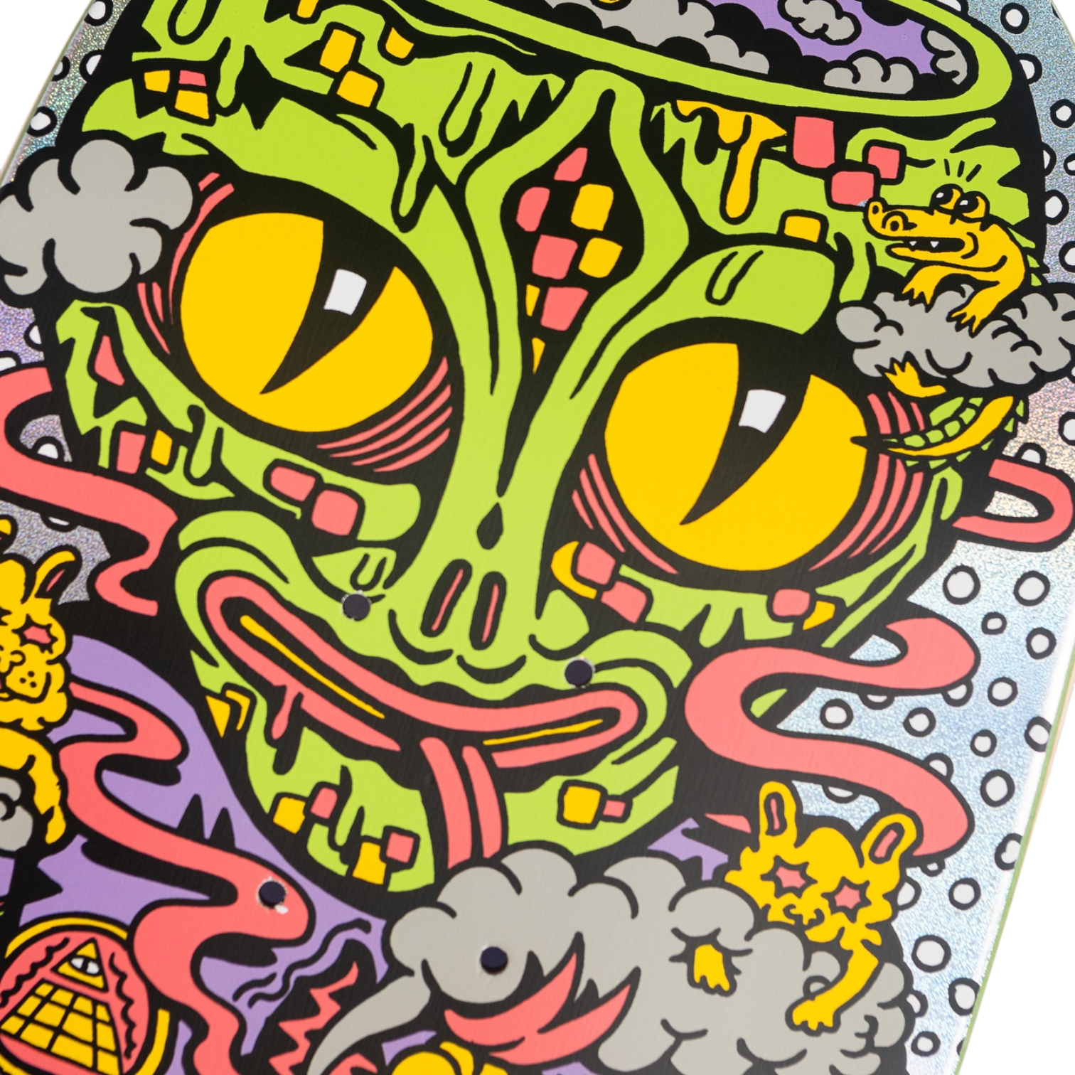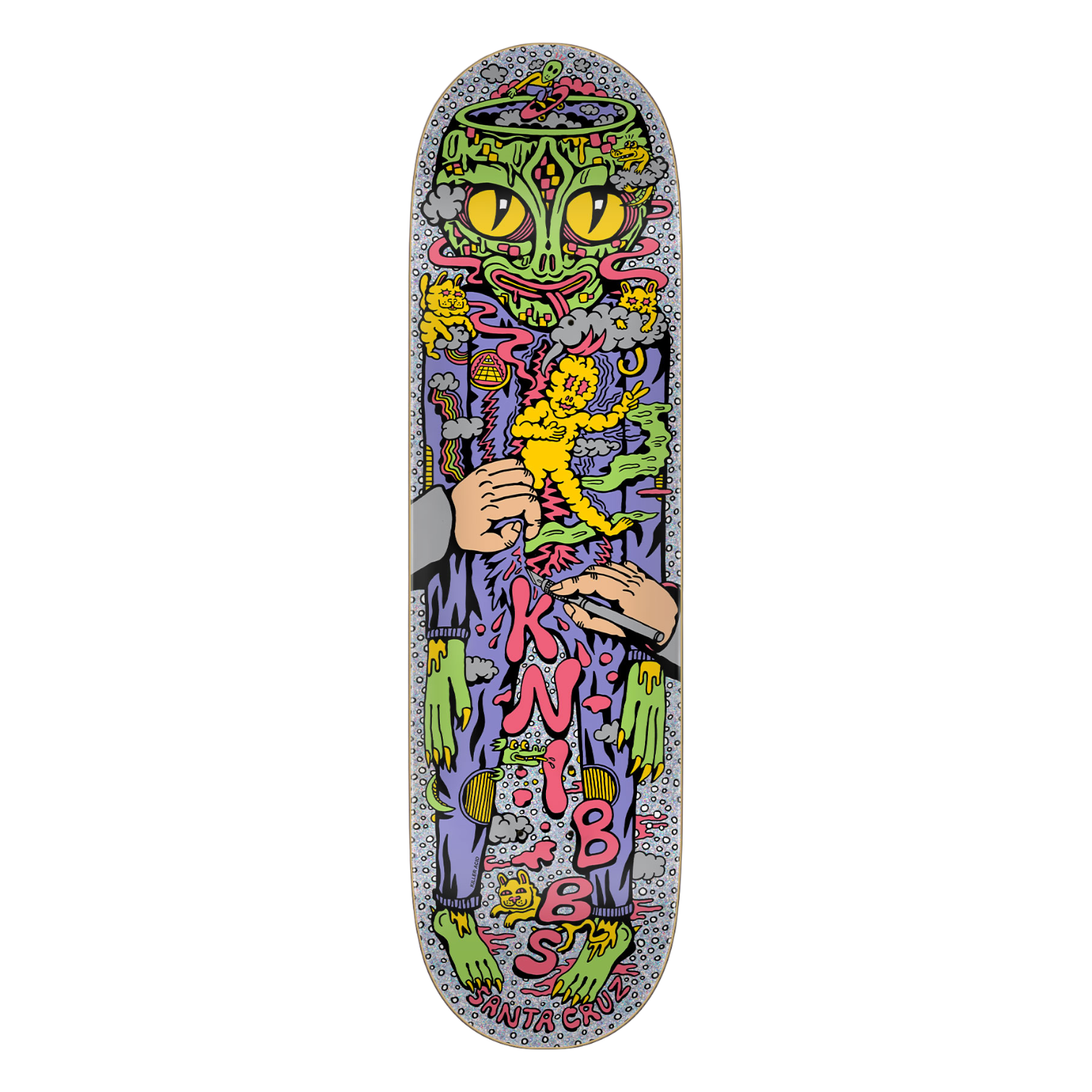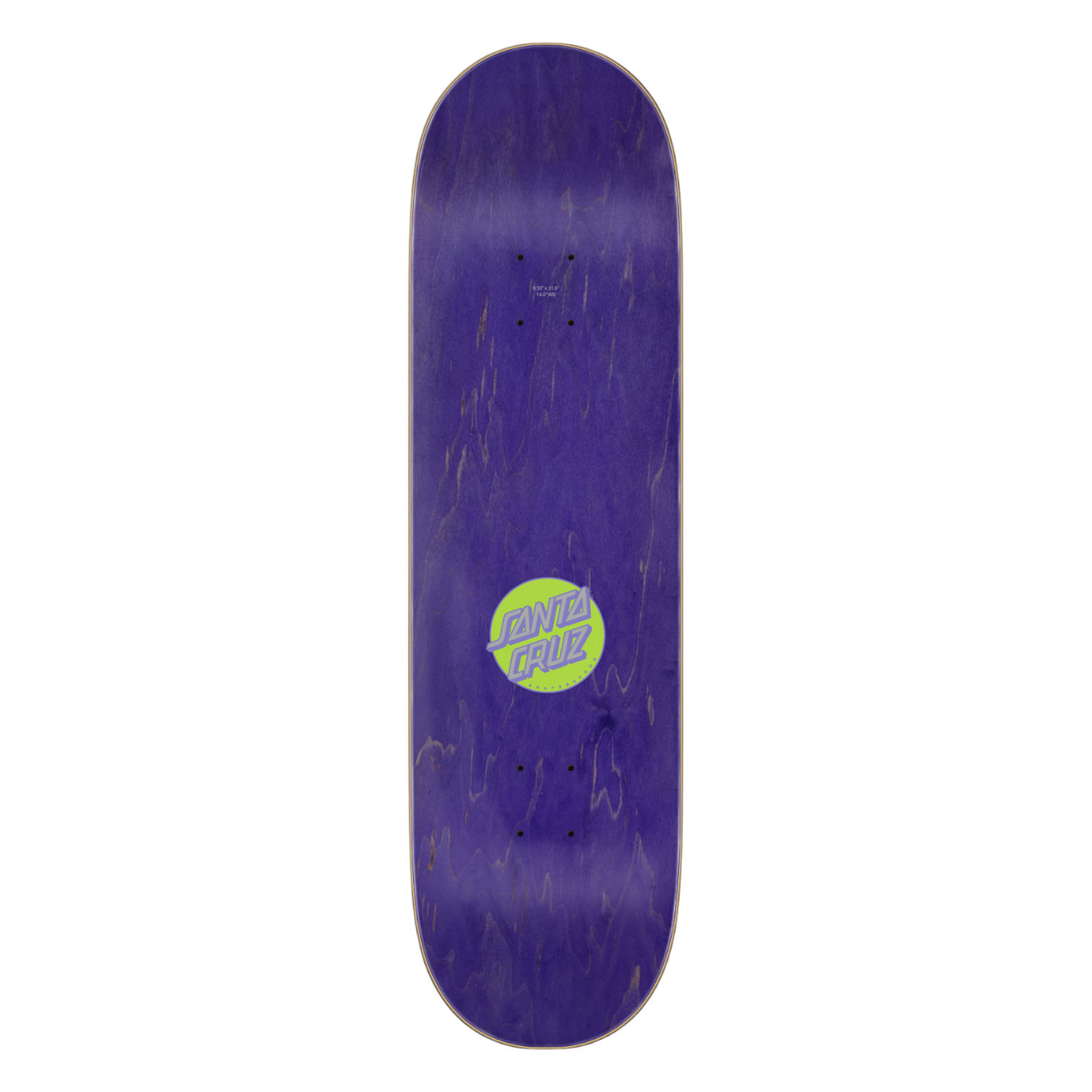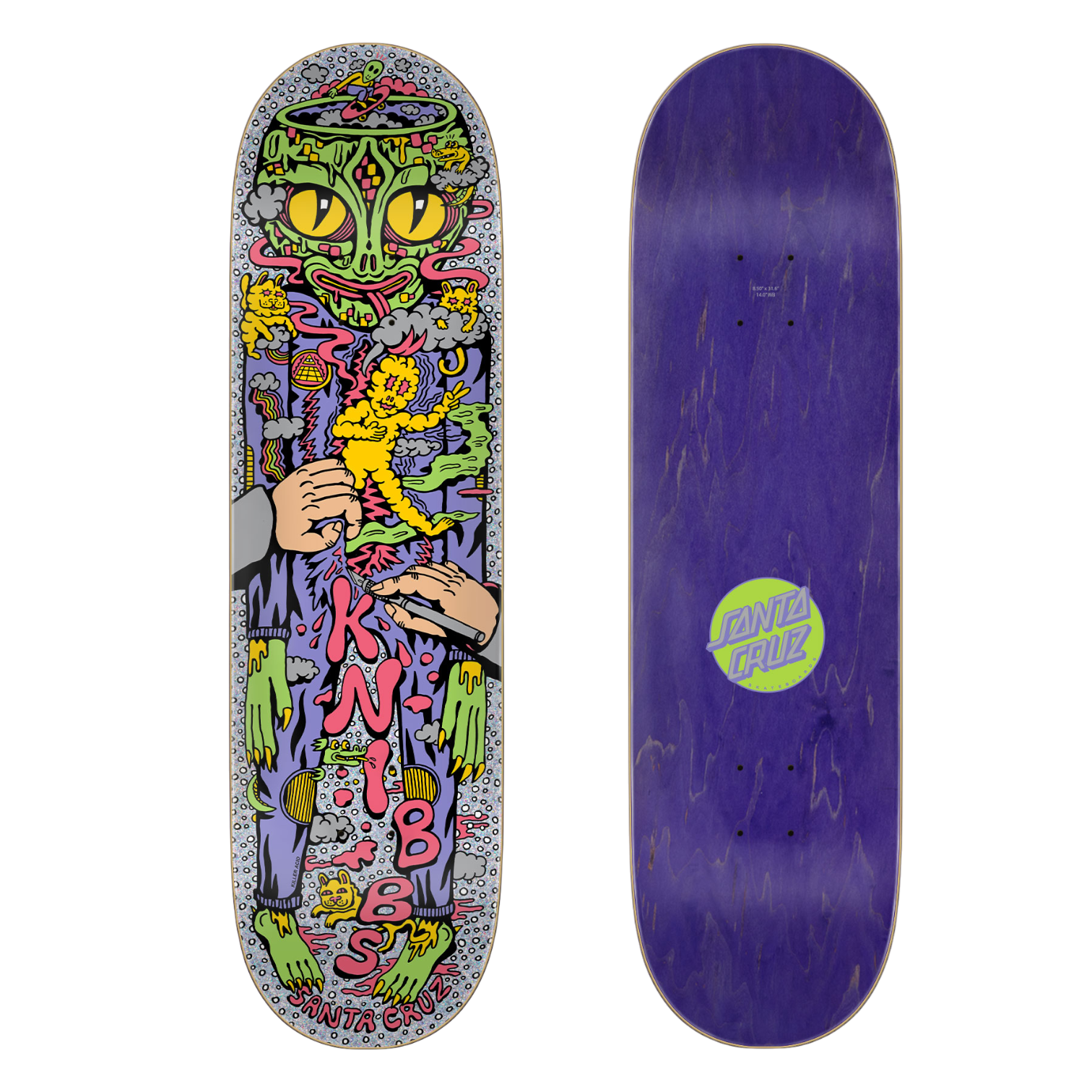 The Santa Cruz Skateboards Knibbs Reptilian Pro 7 ply deck features Jereme Knibbs' 8.5" shape, 14" wheelbase, Knibbs Reptilian artwork printed over silver quicksand foil deck bottom and Santa Cruz Classic Dot art on purple stain deck top.
